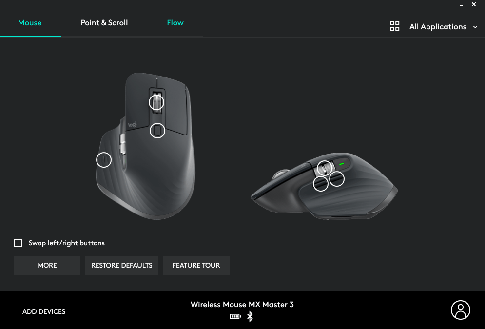 The MX Master features a wealth of customization settings via the Logitech Options software that allows for configuring what each button does when using certain apps. Pre-installed button profiles are readily available for essential apps such as Microsoft Word, Excel Adobe Photoshop, Google Chrome… However, having the option to fully customize app specific settings and add new applications makes accomplishing tasks faster and smarter.